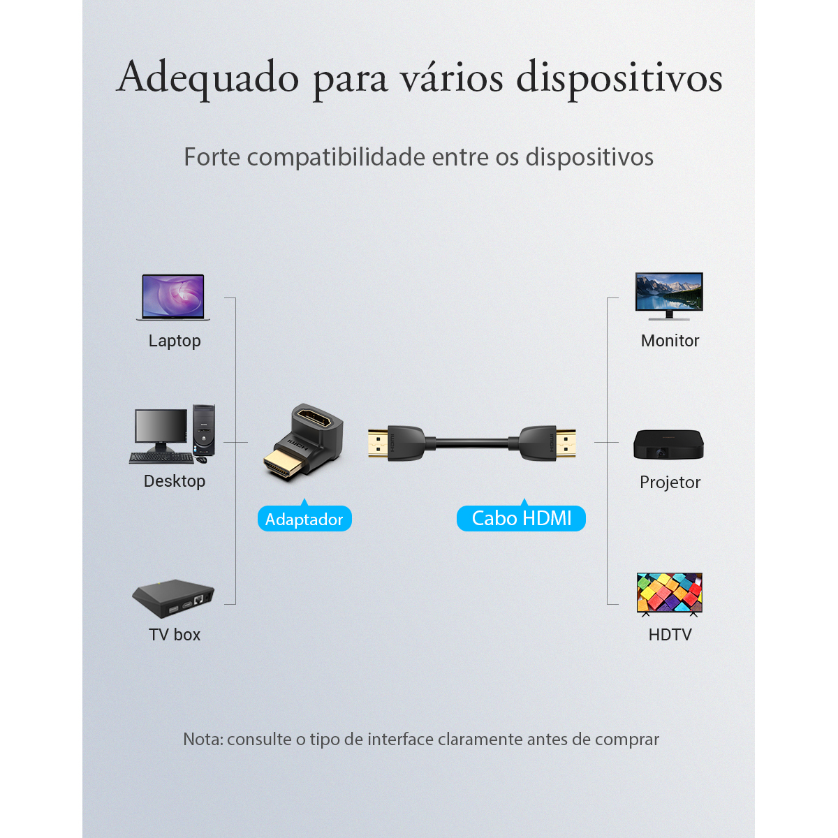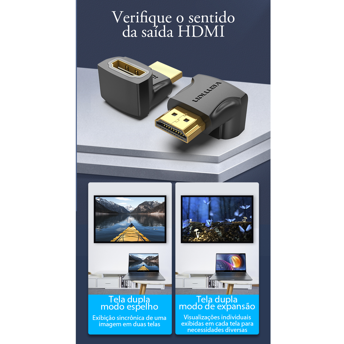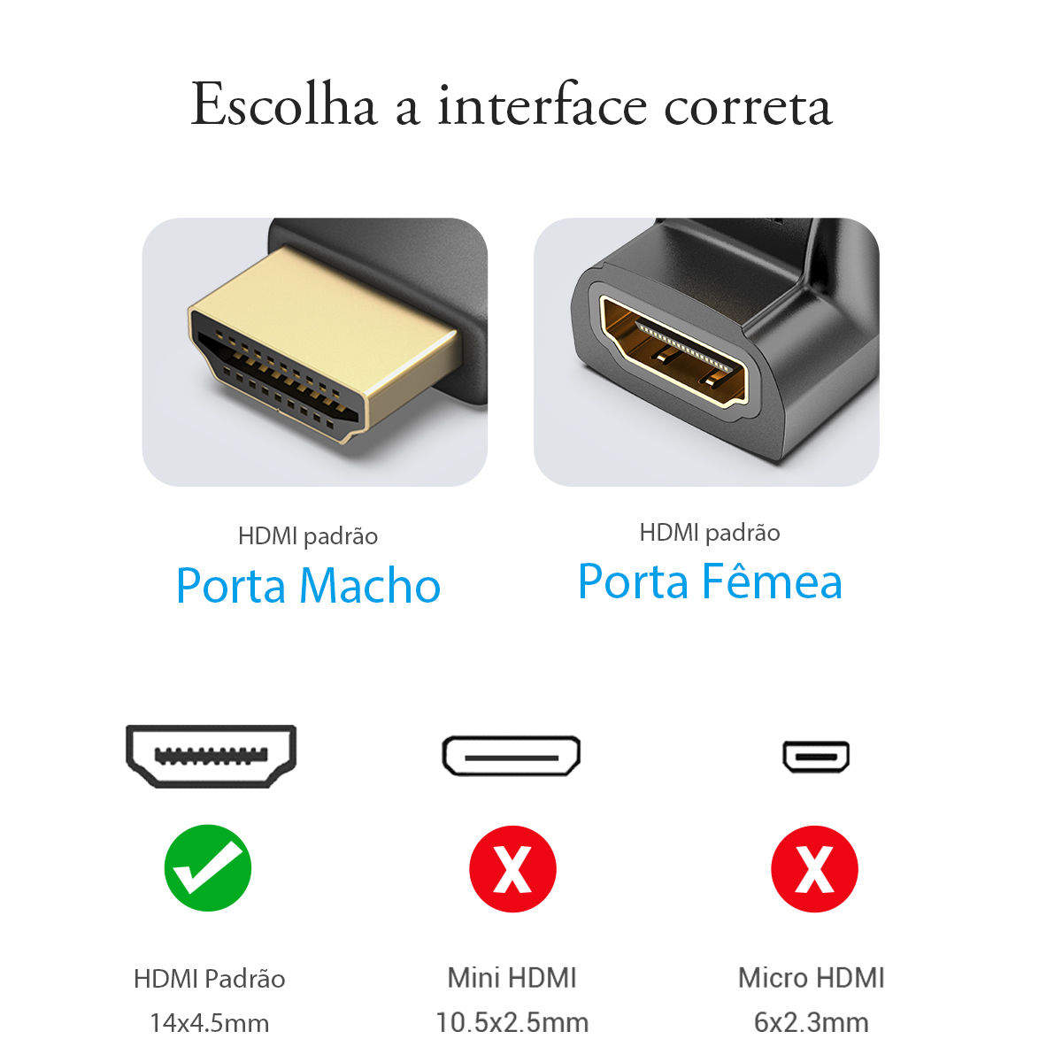 ATENÇÃO: Verifique atentamente a posição da direção do HDMI nas imagens antes de finalizar sua compra. A orientação do conector pode variar de acordo com a instalação desejada.